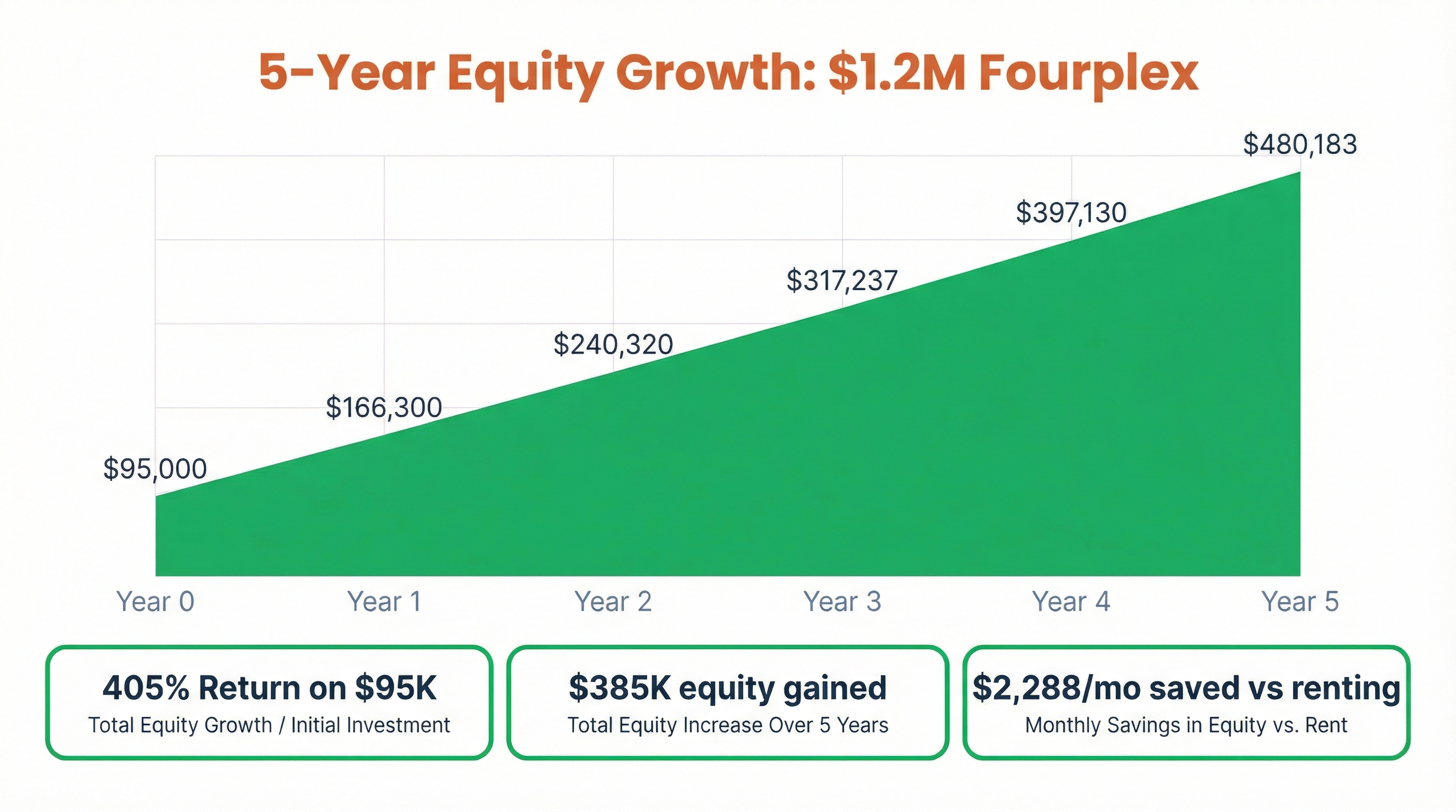 A fourplex in Metro Vancouver is a wealth-building engine, not a passive income play. With a $1.2M purchase, 5% down, and a 3.9% mortgage rate, you're roughly break-even in year one — and that's the point. You're living for nearly free while tenants build your equity. After five years, you're sitting on roughly $480K in equity from a $95K investment. That's leveraged wealth building with a roof over your head.