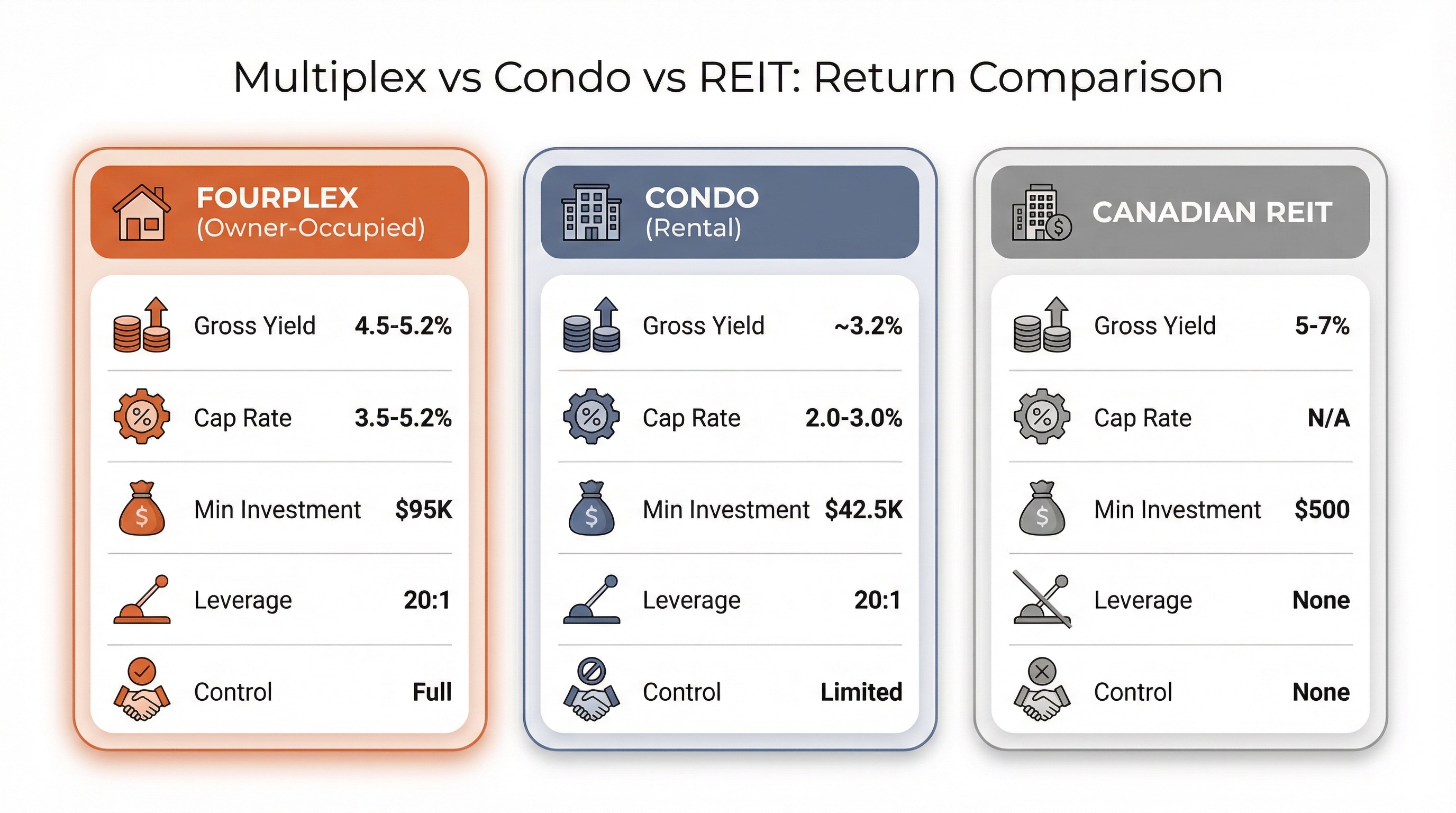 | Metric | Fourplex (Owner-Occ.) | Condo (Rental) | Canadian REIT |