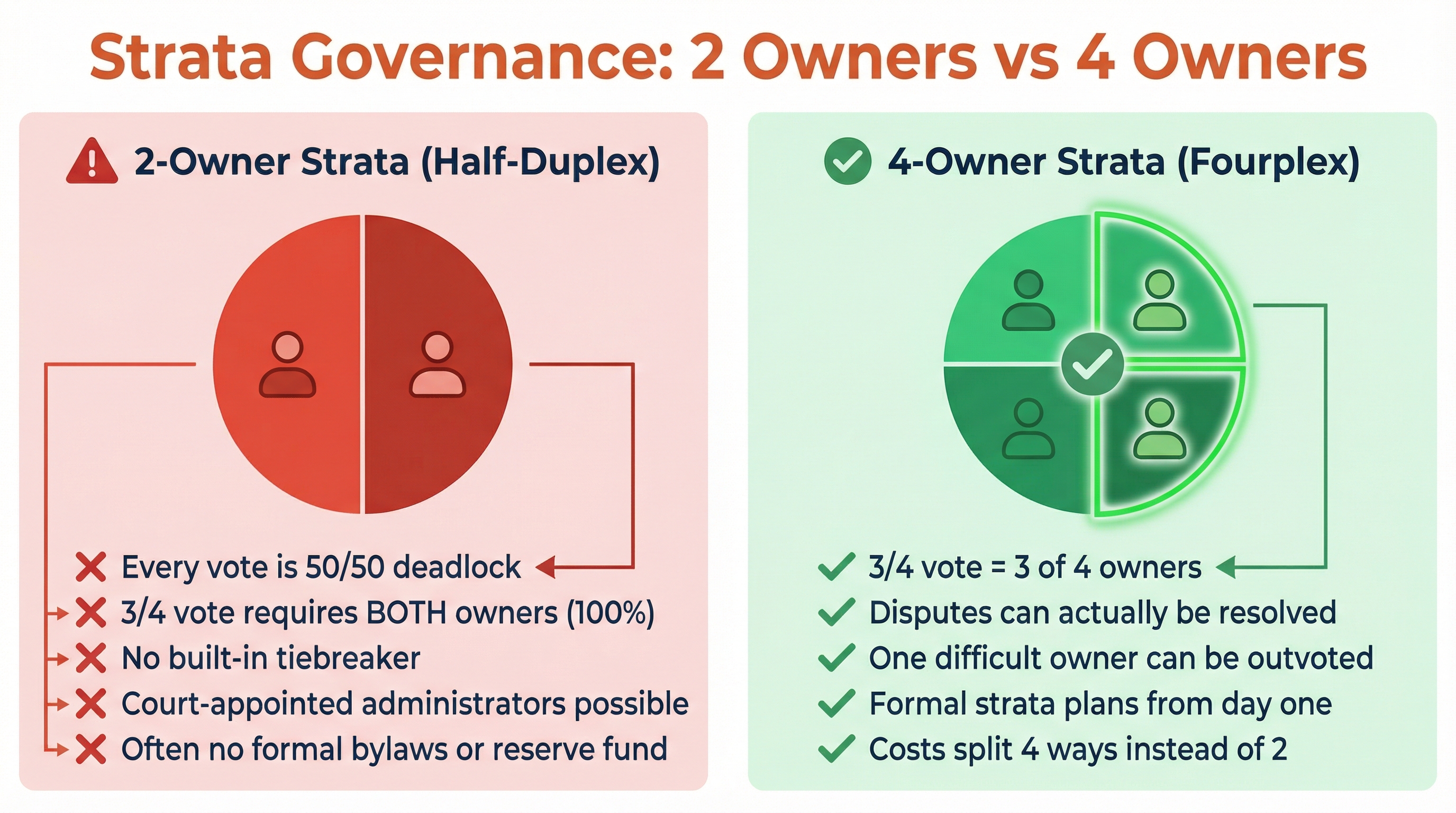 Two-owner stratas sound simple until there's a disagreement. Every vote is 50/50. BC courts have appointed administrators for deadlocked duplexes. Four owners at least allow 3/4 majority votes to break ties.