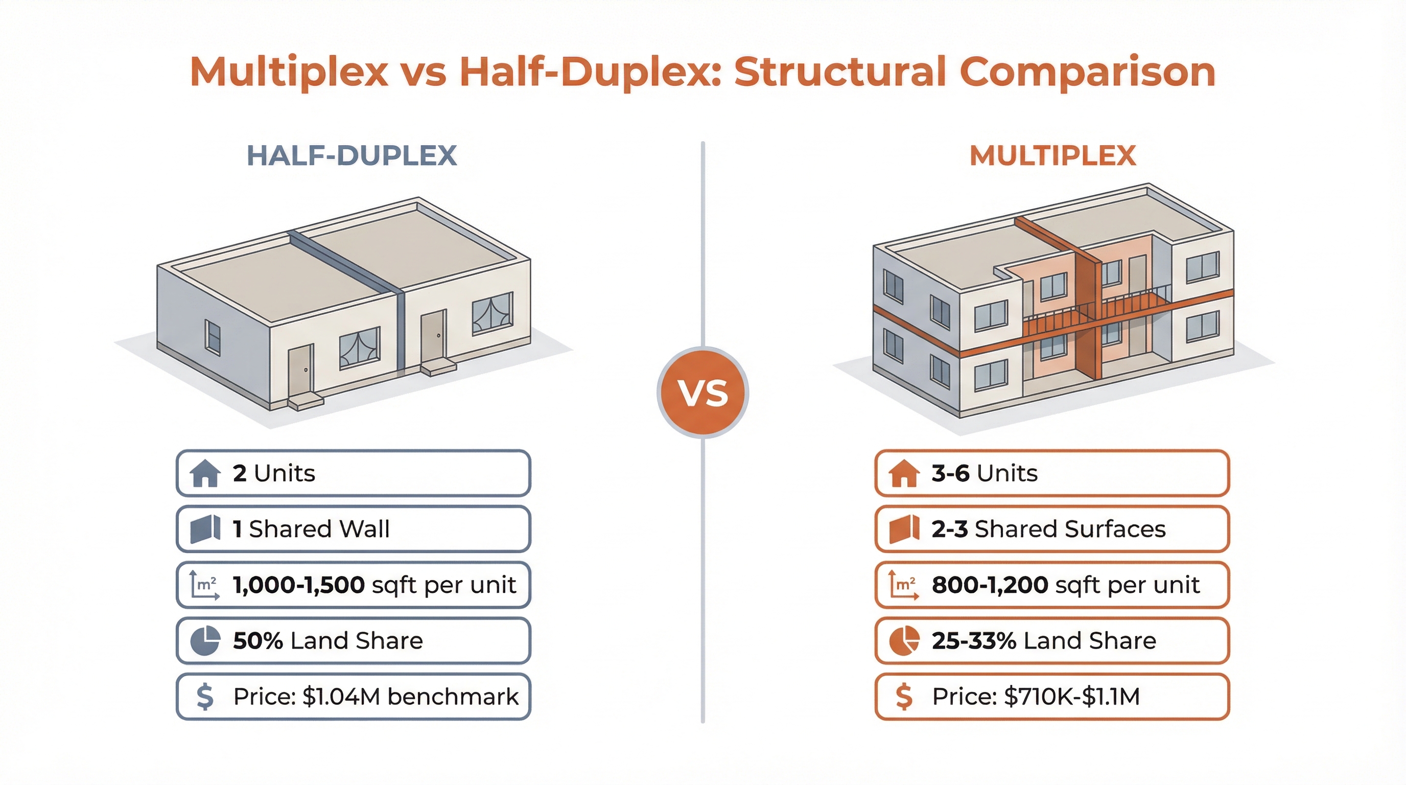 A half-duplex is one of two units sharing a wall or floor. A multiplex is 3-6 units on a single lot — more neighbours, more shared systems, but also more rental income potential and lower per-unit costs.